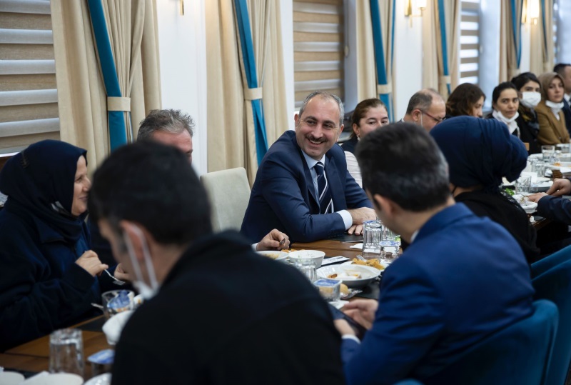 Adalet Bakanı Abdulhamit Gül, öğle yemeğinde bir araya geldiği personele özverili çalışmalarından dolayı teşekkür ederek, özlük haklarının daha da iyileştirilmesi hususunda çalışıldığını söyledi.